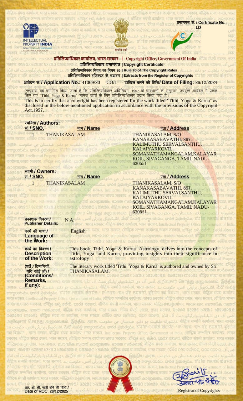 “திதி, யோகம் & கரணம்” – நூல் ஆசிரியர் திரு. தணிகாசலம் அவர்கள் எழுதிய “Tithi, Yoga & Karna” (திதி, யோகம் & கரணம்) என்ற ஜோதிட நூல், இந்திய அரசின் Copyright Office மூலம் அதிகாரப்பூர்வமாக பதிவு செய்யப்பட்டிருக்கிறது. இந்த பதிவு Copyright Act, 1957 சட்டத்தின் கீழ் வழங்கப்பட்டுள்ளது. இந்த நூல் கீழ்க்கண்ட முக்கிய ஜோதிட கூறுகளின் ஆழமான விளக்கத்தை வழங்குகிறது: திதி (Tithi) – சந்திர நாளின் வாழ்க்கை மீதான தாக்கம் யோகம் (Yoga) – பிரபஞ்ச சக்திகளின் இணைவு கரணம் (Karna) – செயல்களுக்கும் அதன் பலன்களுக்கும் தொடர்புடைய காலப் பிரிவுகள் இந்த அரசு அங்கீகாரம், ஆசிரியரின் தனித்துவமான சிந்தனை மற்றும் ஆராய்ச்சியை உறுதிப்படுத்துகிறது.